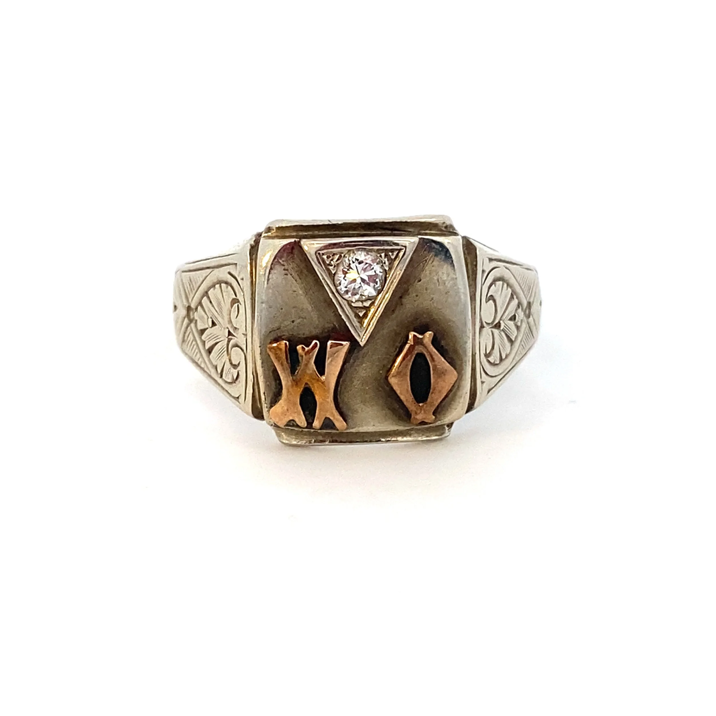 The center stone is accented by small sparkling diamonds on either side, adding just the right amount of brilliance while keeping the design refined and balanced. The split shoulder band gives the ring a light, airy feel while enhancing its vintage charm.